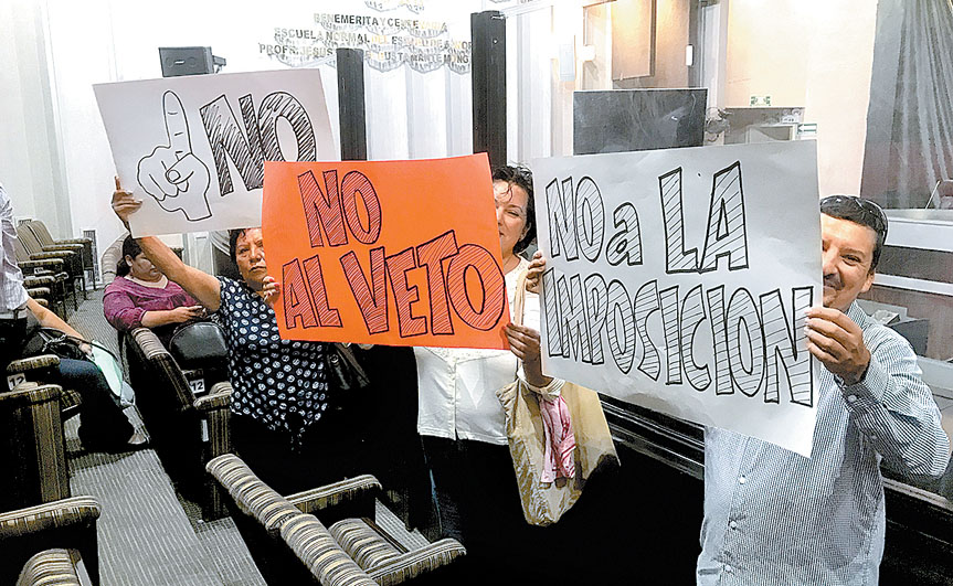 Además, varios diputados locales protestaron dentro del recinto Legislativo y mostraron pancartas con las leyendas: “No al veto” y “No a la imposición”.